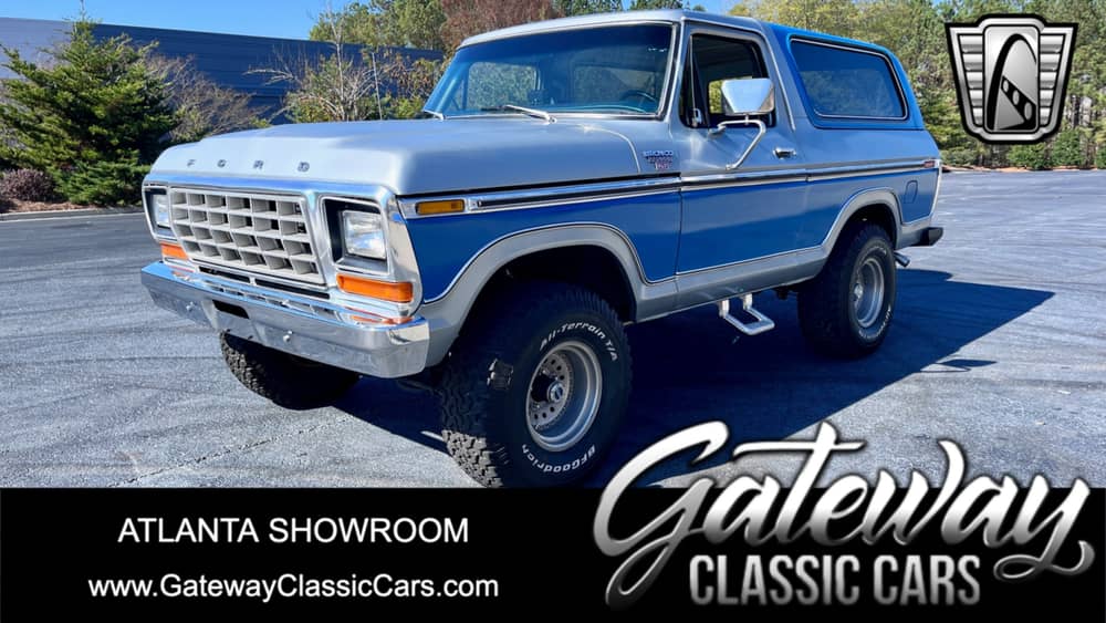 Gateway Classic Cars of Atlanta is proud to present this 1978 Ford Bronco. Following its successful debut, Bronco sales reached record levels after the launch of the 2nd generation Bronco in 1978. The first two years of the larger and more luxurious Bronco were some of the most popular 30-year production run. Bronco shifted to a larger platform and body-style sharing components with the F-Series truck while maintaining key off-road capabilities including maneuverability, and approach, departure, and breakover angles. The second-generation Bronco has a coil-sprung Dana 44 front axle and a leaf-sprung rear Ford 9-inch axle (like the later first-generation Broncos). The first- and second-generation Broncos both have non-independent front suspension (solid front axle). Powering this Bronco is the 5.8 Liter V8 backed by a C6 3-Speed Automatic Transmission. This Bronco is painted two-tone blue and grey with a blue cloth interior. Options on this 1978 include: Air Conditioning, Kenwood AM/FM Radio, Power Brakes, Power Steering, Seat Belts, and Custom Wheels.