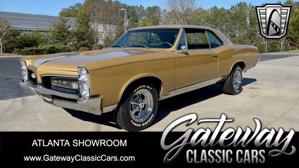 Gateway Classic Cars of Atlanta is proud to present this cool 1967 Pontiac GTO. The Pontiac GTO took the world by storm in 1964 and quickly cemented itself in muscle car history. As the GTO lasted five generations in total, it underwent many different changes, responding to new challenges and attempting to give buyers an upgraded driving experience. Though relatively short-lived, the Pontiac GTO is still a favorite of many muscle car enthusiasts who love its striking style and roaring horsepower. Powering this 1967 Pontiac GTO is the legendary 400 CID V8, with all the power at the pedal you can rest assured that when you need to speedy on by the slowpoke parking in the fast lane you will have no issues showing them your taillights! . This gold '67 GTO is packing a 4-speed manual which will snap your head back If you punch it, designed to get the power to the ground! Driving the car is a joy. It is quick and responsive and handles well. Options on this 1967 Pontiac GTO include: AM/FM Radio, Power Steering, Radial Tires, Rally Wheels, Seatbelts, and Black Vinyl Interior. When I was young and roaming the streets looking for a race or trouble there were two three letter words that always caused panic. The first word was "cop" the second was just as scary "GTO". Don't hesitate to put this GTO in your garage today!