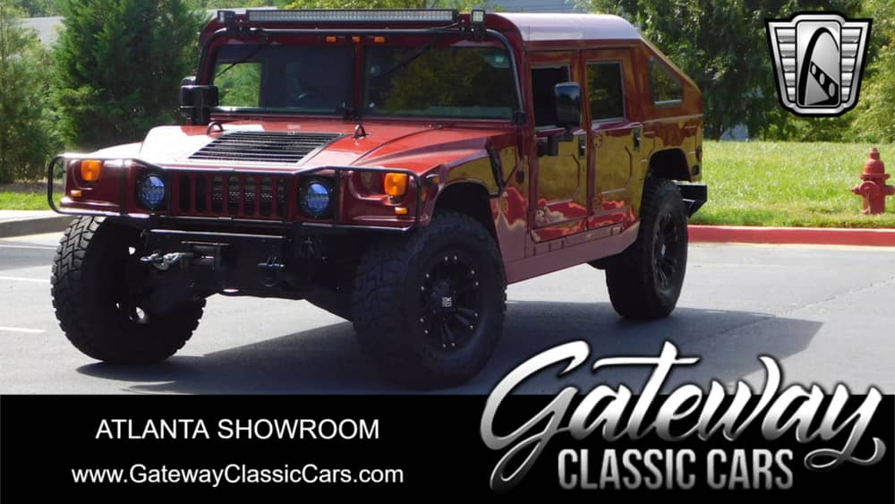 Introducing the highly impressive 1999 Hummer H1 Slant Back, a stunning embodiment of strength and style. With its dramatic red exterior and sophisticated red leather interior, this beauty exudes boldness and confidence like no other.