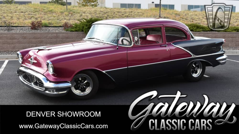 Gateway Classic Cars of Denver presents this stunning 1956 Oldsmobile 98, a true classic that exudes both style and power. This vintage beauty is finished in a unique Raspberry/Charcoal exterior that is sure to turn heads wherever you go. The color combination is a tasteful blend of vibrancy and sophistication, making it a standout in any crowd.