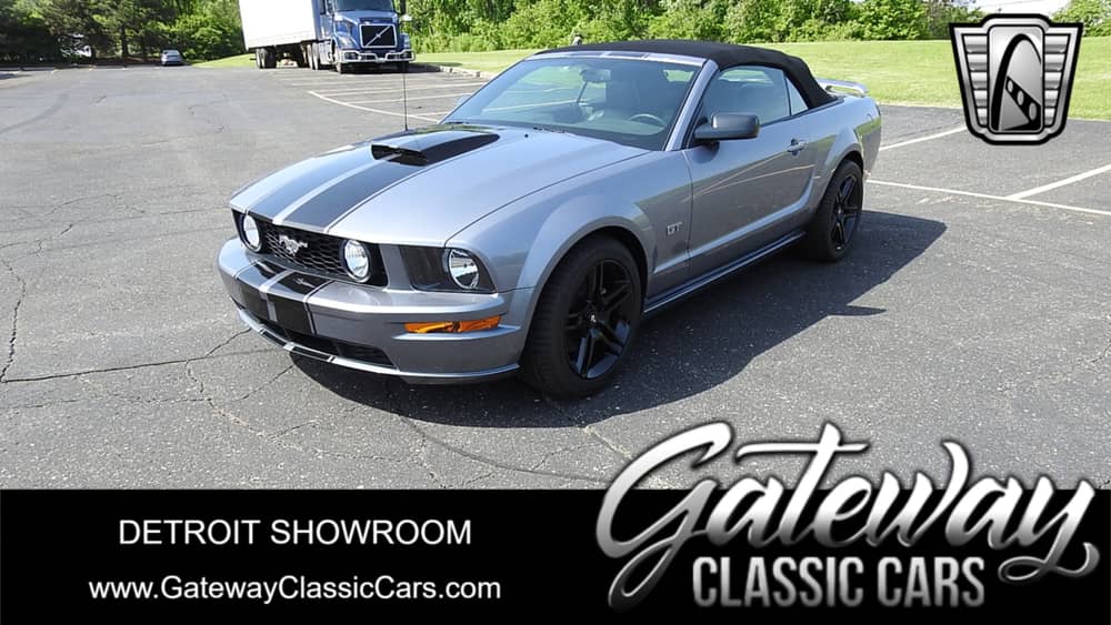 Gateway Classic Cars is proud to present this 2007 Ford Mustang GT Convertible! Redesigned in 2005, the fifth-generation Mustang's styling echoes the famous Mustang models of the late-1960s, codenamed "S-197". This mustang is equipped an aluminum block 4.6 L SOHC three-valve Modular V8 with variable camshaft timing (VCT) mated to an automatic transmission. Behind all that, it is equipped with a 3.73 rear end. This Mustang GT is finished in Tungsten gray with black stripes and leather seats, and a black convertible top. This one in particular has aftermarket black 18 inch wheels, and a aftermarket exhaust system by dynomax. With only 14,233 miles, this is one clean 5th gen mustang!