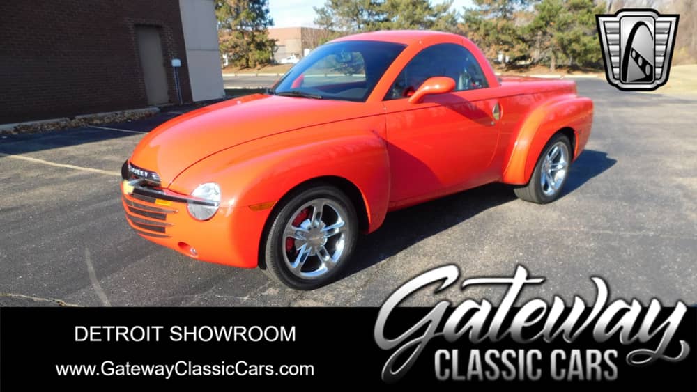 Gateway Classic Cars of Detroit is proud to present this 2005 Chevy SSR. The SSR styled design was inspired by Chevrolet's late-1940s trucks, in particular the 1947-1955 pickups. The vehicle rode on a GM368 platform specific to it, a version of the period's highly adaptable GMT360, and featured a steel body retractable hardtop designed by Karmann and built by ASC. Early SSR's came with a decent 300 horse 5.3 V8. But by 2005, the mighty LS2 V8 6.0 liter was fitted, with a very respectable 390 horsepower. This 6.0 is mated to a 6-speed manual transmission. The 6-speed manual examples are quite rare with only 2,213 units being made! Finished in the color "Redline red" which pairs great with the black leather interior, both are in great shape. The retractable hardtop works great. With nothing to unbolt or even latches to pull, this top goes down with just the push of a button.