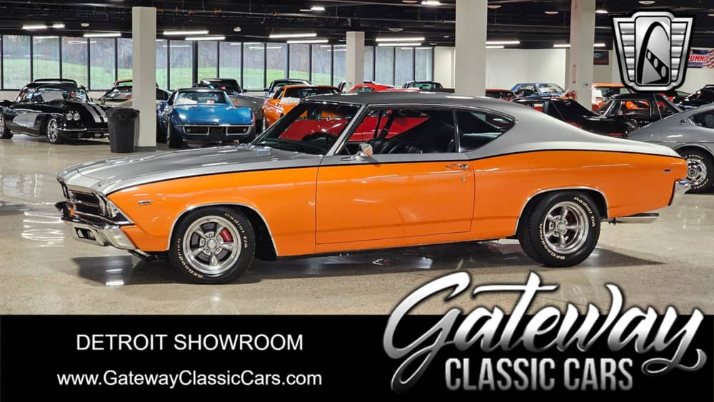 Gateway Classic Cars of Detroit is excited to present this 1969 Chevrolet Chevelle! The stunning two-tone silver and orange exterior is complemented by a sleek black vinyl interior, creating a striking combination of style and performance. Loaded with extra goodies, this Chevelle turns heads wherever it goes. With the cost of building one like it soaring, you won't find a better deal than this. Don't miss your chance to own a piece of automotive history- get behind the wheel of this '69 Chevelle today!