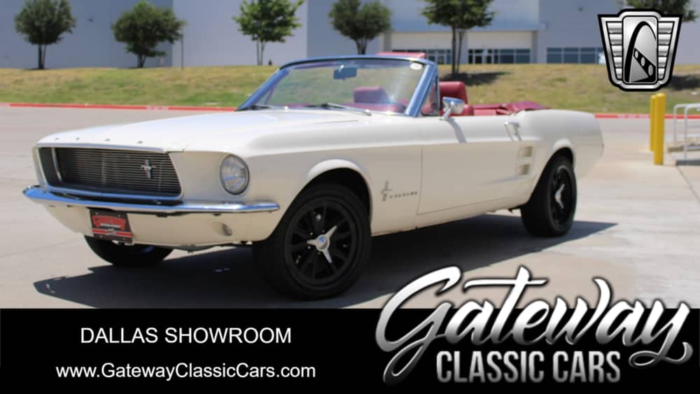 Gateway Classic Cars of Dallas is excited to offer this 1967 Ford Mustang Convertible. The current owner obtained this ’67 locally in Texas about 4 years ago and is now ready to allow it into another collection. Walking around this Mustang one should notice the gloss Wimbledon White paint that is offset with a replaced black soft convertible top. The Soft top and frame were replaced in 2017, as well as a new radiator, alternator and Ignition system. Adding to the curb appeal are 4 17” alloy wheels painted black wrapped in radial tires, chrome grille, chrome bumpers, chrome mirrors, and even a red boot to cover the top when down. The red and white interior theme flows well with the exterior. Additionally, the interior features a custom center console, red vinyl bucket seats, seat belts, painted to match white door panels with red inserts, an aftermarket steering wheel, AM/FM radio, and even red carpeting. This piece of Ford history mixes V8 performance with some modern comfort equipment. Some options include R134a air conditioning, power convertible top, power brakes with front disc, etc. Powering this beast is a 289 CID V8 engine that is mated to a C4 3-speed automatic transmission. By 1967 the Mustang was king, as the convertible version sold the most convertible units (over 72,000 of them), nearly 2 to 1 over the next closest convertible competitor, the Chevrolet Impala. If you are looking for a convertible Mustang, this example could be the one for you.