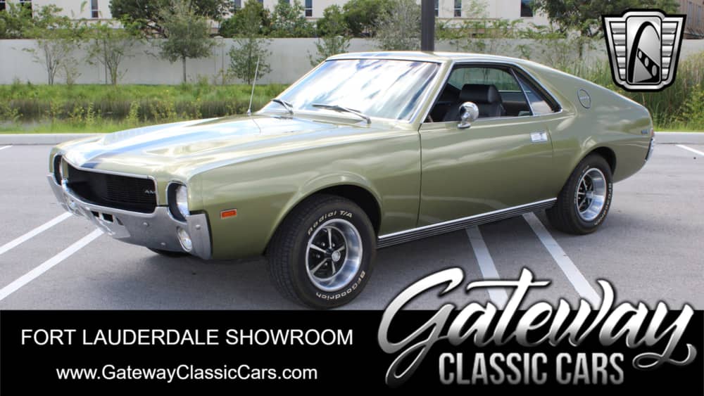 Step into the past with this striking 1969 AMC AMX, a classic American muscle car that's sure to turn heads wherever you go. The bold green exterior color is a good match for the sleek black vinyl interior, creating a timeless look that's both stylish and sophisticated.