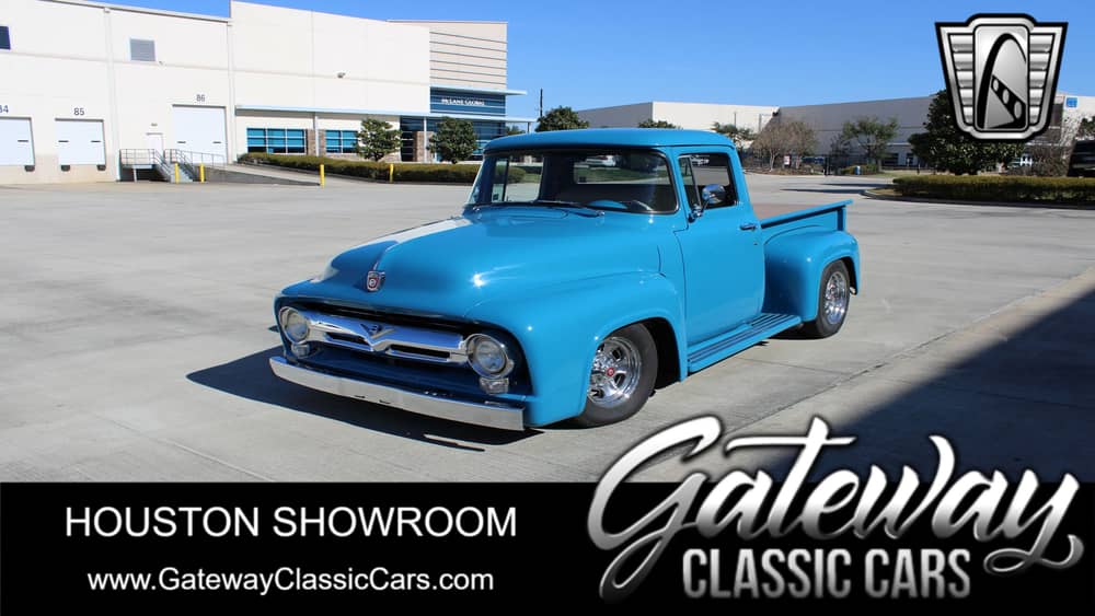 Gateway Classic Cars Houston showroom is pleased to present this beautiful blue 1956 Ford F100 Pickup Truck. For the 1956 model year, an all-new version of the F-Series made its debut. Increased dimensions, improved engines, and an updated chassis were features of the second generation, and the naming scheme change for the F-Series remains in place to the present day. The half-ton F1 became the F100 (partially influenced by the North American F100 Super Sabre jet fighter). This 1956 F100 has undergone a radical restoration. It is now powered by a peppy roller cam-equipped 302 H.O. V8 that's backed by a performance-built AOD (4-speed) automatic from Monster Transmission. Thanks to the wrapped headers and dual exhaust setup, this truck has an aggressive throaty rumble to match its style. Although the truck appears to be just a mild-mannered '56 F100, it is packed full of features, including a 1999 Ford Ranger front clip with power rack and pinion steering, Cragar aluminum wheels with radial tires, power front disc brakes, Howell throttle body fuel injection, remote power door locks, power windows, Vintage Air A/C, Dakota Digital A/C controls and cruise control, Wise Guys heated bench seat with accessory ports (covered in high grade synthetic leather), RetroSound AM/FM head unit, Classic Instruments gauge cluster, Oak bed flooring, electric cooling fan, CrafTec tonneau cover for the bed, GM Tilt Steering column, aluminum driveshaft, and custom-installed taillights from a 1962 Corvette. This '56 F100 is loaded and ready for its next owner, so give us a call and grab it before someone else does!