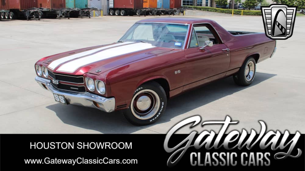 Gateway Classic Cars of Houston is proud to present this 1970 Chevrolet El Camino SS Tribute. The Chevrolet El Camino is a coupe utility vehicle that was produced by Chevrolet between 1959–60 and 1964–1987. Unlike a standard pickup truck, the El Camino was adapted from the standard two-door Chevrolet station wagon platform and integrated the cab and cargo bed into the body. The 1970 models received sheet metal revisions that gave the bodies a more squared-up stance, and interiors were also redesigned. The maroon paint has an instant appeal from the unmistakable glow of a modern application. It allows the sunshine to roll evenly across the body. The brightwork is complete on everything from the mirror-like chrome bumpers to the trim that surrounds the truck bed to the color-matched Rally wheels. White always looks terrific against maroon, and so it's great to have upgrades like the painted dual Rally stripes and coordinating grille to give this a proper SS style. The white stripes of the exterior get you ready for the muscle car style of the white interior. The El Camino shares a lot of its appeal with the Chevelle, and that includes the inside, too. The carpeting, dash, headliner, and seat all retain their bright appearance. There's an upgraded AM/FM digital tuner with new speakers. Under the hood is a 350 CID V/8 that is topped with an Edelbrock carburetor and polished air cleaner, long tube headers that go into a dual exhaust, this makes for a solid powerhouse that is the heart of any cruiser. Add in a three-speed automatic transmission with power steering, power brakes, and this sharp-looking El Camino is easy to show off near or far.