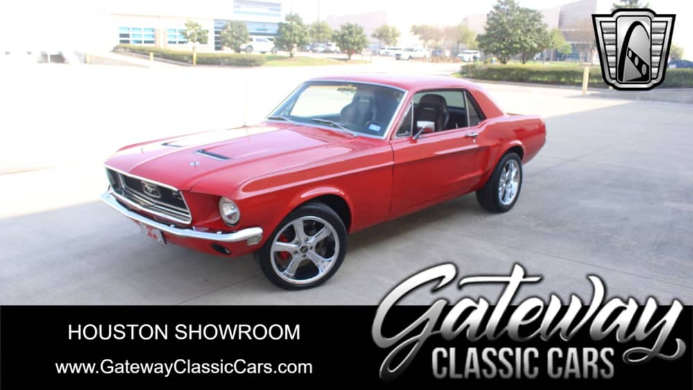 Gateway Classic Cars Houston Showroom is proud to present this sweet 1968 Ford Mustang. This pony is rocking a bright red paint job, and a jet-black interior, so it's a real eye catcher. The potent 302 CID V8 in the engine bay has been upgraded with an Edelbrock 4BBL carb atop its aluminum intake, and a GM-Style HEI provides improved spark vs. the original ignition setup. Headers funnel exhaust gases into its true dual exhaust, which provides that classic muscle car sound. Backing the 302 is a 3-speed automatic transmission, which sends the twist to the Ford 9-inch rear. Front disc brakes have been added, which helps slow this peppy Mustang down better than its original 4-drum setup. This little 'Stang is riding on polished chrome aluminum wheels, which are wrapped with low profile performance radials, which further ride and driver control. Inside, the first thing you'll notice is the high back synthetic leather buckets with their red stitching (to complement the red exterior). Between the well-bolstered front buckets and their Aces Racing 4-point harnesses, you'll get quite the "competition feel" when you're strapped in up front. A custom center console has been added as well (after all, in 1968, no one was toting their Super Big Gulps along), but these days, "ya gotta have cupholders"! The rear bench was also recovered in matching, red-stitched black synthetic leather, to maintain a consistent scheme. Occupants will appreciate the addition of the Vintage Air A/C (uses R134a refrigerant), and they'll also get a "kick" out of the sound system, with its new retro-style head unit and its triple 10-inch subwoofer enclosure in the trunk. Two amps power the system, so it can really rattle your teeth if you want! The trunk also features a custom, twin piston power open/closing system, which is something one doesn't see every day. Other recent updates include new halo headlights, a new wiring harness, anti-theft system, new starter, alternator, and weather stripping all around. This bright red '68 Mustang is ready to hit the highway with its new owner, so call or email our Houston Showroom today to make it yours!