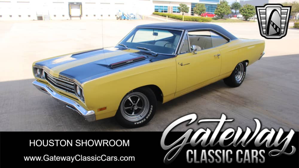 Gateway Classic Cars Houston Showroom is excited to offer this awesome Sunfire Yellow 1969 Plymouth Road Runner for sale. While this beast may have started out with a 383 under the hood, now it's sporting "The Mopar Legend": a custom-built, balanced, and blueprinted Gen II 426 CID Hemi, which was built by 426 Hemi Specialist Jeff Shmanske. There is too much detail to list all of the specs in this writeup, but we'll be happy to email the complete specs and parts list. What we can fit in is it's a 4.50" bore Hemi block with water jacket cooling for street use, all moving parts were fully detailed, and precision machined during the build process. It has ARP main hardware, a Melling HV oil pump, forged steel 8-bolt Hemi crank, H-beam connecting rods (ARP 2000 cap screws), custom forged 10.25:1 pistons, Moly coated rings and bearings, USA made Mopar cast iron heads (170cc chambers) with high performance valve job, premium valve springs/locks/retainers, FelPro head gaskets, high performance USA made new old stock Mopar steel rocker arms (select fit to shafts), custom ground flat tappet cam (.550 lift, 285 deg duration, similar to '68-'69 street Hemi cam), Cloyes double roller timing chain, Smith Bros. HD custom pushrods with polished cups and ball ends, and the entire rotating assembly was precision balanced and blueprinted. A 114-picture build album will come with the car, showing each part and step in the build process for the Hemi, which has only about 250 miles on it since installation. Reed's Rod Shop in California completed the build once the Hemi was delivered to them. They completely rebuilt the front suspension, added a serpentine belt system, installed a massive Ron Davis Racing aluminum radiator with electric fan, a new flywheel and clutch assembly, new bell housing, and custom fabbed the installation for the Wilwood hydraulic slave cylinder for the hydraulic clutch actuator. They also rebuilt the existing A33 4-speed manual transmission, ensuring that it was built to handle the big Hemi's power. The power steering system was also rebuilt, and front disc brakes were added (along with a Wilwood Hydroboost power assist system). The wiring harnesses were replaced, as well as the fuel tank, and corresponding new fuel lines and high-volume fuel pump to support the dual-quad-equipped Hemi's appetite for fuel. The big 426 has a custom dual exhaust system, including TTI ceramic coated long tube headers and a custom-fabbed X-pipe. Out back, the Mopar rear end is outfitted with a SureGrip differential and highway friendly 3.55:1 gears. Inside, while the dash has been outfitted with a Dakota Digital TRX gauge cluster, it looks like an original (which was the intent behind the restoration - make it look like it did when it was new). The rest of the interior shows that the efforts were successful - the white synthetic leather seating, black carpet and floormats, and white headliner all look practically unused. The weather stripping and window felts are also either new or in great shape throughout. This beast rides on original-looking Magnum 500 style wheels, which are wrapped in RWL Cooper Cobra radials, finishing off the classic look and stance of this amazing 1969 Road Runner. This bad boy is one of the nicest Road Runners we've had the pleasure of offering, and with the engine "build photo album" and tons of receipts and invoices that will accompany it, you'll want this for your Mopar collection!