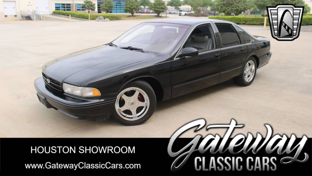 Gateway Classic Cars Houston Showroom is excited to present this menacing black 1996 Chevrolet Impala SS, a classic American sedan that combines power, comfort, and style. Technically a Caprice with the Impala SS RPO, this bad boy is finished in a sleek black exterior color, complemented by gray leather seats and gray carpet, creating a timeless look that is sure to turn heads. Under the hood, you'll find a robust 5.7 Liter LT1 V8 engine, which is backed by a smooth 4-speed automatic transmission, delivering a driving experience that is both powerful and effortless. This Impala SS is equipped with a host of features designed to enhance your driving experience. Stay cool and comfortable with the air conditioning system and enjoy your favorite tunes with the AM/FM radio and CD player. The power seats, mirrors, locks, and windows add a touch of convenience, while the cruise control feature allows for relaxed, long-distance driving. Safety has not been overlooked on this big sled, either. It comes with power 4-wheel anti-lock disc brakes (with slotted and drilled rotors), and traction control to ensure stability and control in various driving conditions. The car is also equipped with an anti-theft system for added security. Driver and passenger airbags are included for your protection, along with seatbelts for all occupants. This Impala SS is riding on chrome plated aluminum wheels wrapped in radial tires, offering road grip and a smooth ride. The rear defogger ensures clear visibility in colder weather, and the tilt steering wheel allows you to adjust the driving position to your comfort. Overall, this 1996 Chevrolet Caprice offers a blend of power, comfort, and safety features, all wrapped in a stylish black exterior. Whether you're a fan of classic American sedans or looking for a reliable car with a host of features, this Caprice is worth considering.