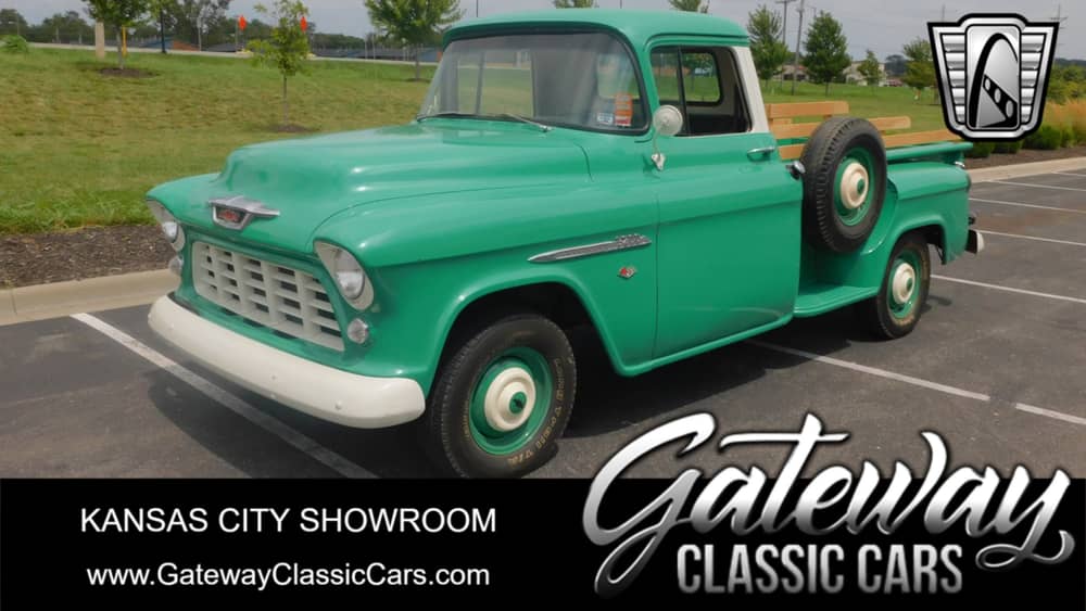 Introducing a classic piece of American automotive history: the 1955 Chevrolet 3200. This timeless truck is presented in a striking green exterior that captures the essence of mid-century style and charm. The vibrant color is complemented by a tasteful black and tan interior, offering a sophisticated yet nostalgic driving experience.