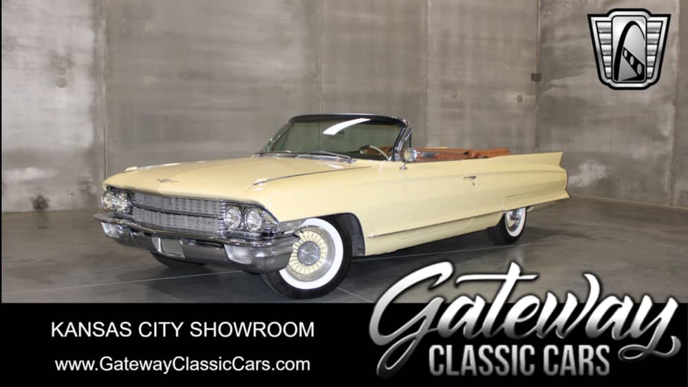 Gateway Classic Cars of Kansas City invites you to step back in time with this stunning 1962 Cadillac Series 62 Convertible Coupe, a true icon of American automotive design and luxury. This classic beauty boasts a striking yellow exterior that uniquely complements its era, turning heads wherever it goes. The elegant design is further enhanced by its automatic convertible top, allowing you to enjoy open-air cruising with ease.