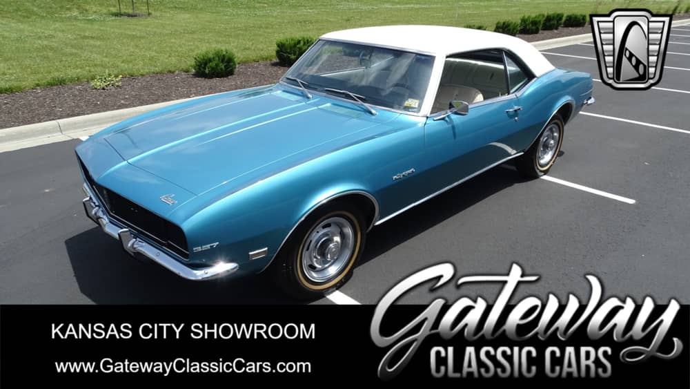 Gateway Classic Cars is proud to offer this nearly all original 1968 RS with the 327 small block V8. Sitting behind the motor is what the owner states to be the original automatic transmission. Not exactly a common color combination, the Turquoise paint with the White Vinyl Top compliments the White interior quite well! Featuring factory air conditioning to keep you cool on summer days. This is the first time this Camaro has seen the market in over 45 years, having been with the same owner for the last four decades. One of very few modifications is the 4 barrel carburetor, in place of the original 2 barrel. Don't miss this one.