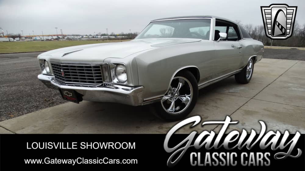 Gateway Classic Cars of Louisville is proud to present this 1972 Chevrolet Monte Carlo! Debuting in 1970 and deriving its name from the famous city, Monte Carlo, nobody knew it would lead to six generations spanning nearly 40 years! The Monte Carlo was dreamed and developed to fill a new roll for the Chevrolet brand. It was actually marketed as the first ever personal luxury car by Chevrolet. This nice example is a 1972 model. In '72 Chevrolet made several small changes from front to back for the last year of the first generation. The chrome really brightens the very sharp silver paint. The black vinyl top provides a nice contrast to break up the color. The 17" Ridler Wheels with Cooper tires really sets the stance. Matching spare wheel in the trunk. Inside you'll find 2-tone black and gray leather bucket seats from a more modern Monte Carlo. This car received an extensive restoration, frame-off rotisserie job around mid 2020. She received a new paint job and new vinyl top. Photos of this work go with the car. Under the hood is a 307ci V8 backed by a Turbo 350 3-Speed Automatic transmission. She is sporting coil springs and a 12-bolt rear end. Per the owner the motor has approx.. 30k miles on it. Absolutely one of the nicest examples we have had here. Per the owner everything has been restored or replaced. Only 4k miles since the restoration. Current owner is an avid collector and loves Monte Carlos, owning 9 over the last 13 years. The current acquired her from a private owner. Title is clean and clear and ready to be transferred into your name now. Don't let this sharp Monte get away, so pick up the phone and call us today! Options on this Monte Carlo include: A/C, Power Steering, Power Brakes, Power Seats, Leather Interior, Tilt Wheel, AM/FM/CD Radio, Seatbelts, Alloy Wheels, and Radial Tires. This 1972 Chevrolet Monte Carlo is offered by our Louisville Showroom and can be seen in greater detail including 100+ HD pictures and an HD video at www.GatewayClassicCars.com. For additional information please call our knowledgeable staff at (812) 294-1555 or email us at .