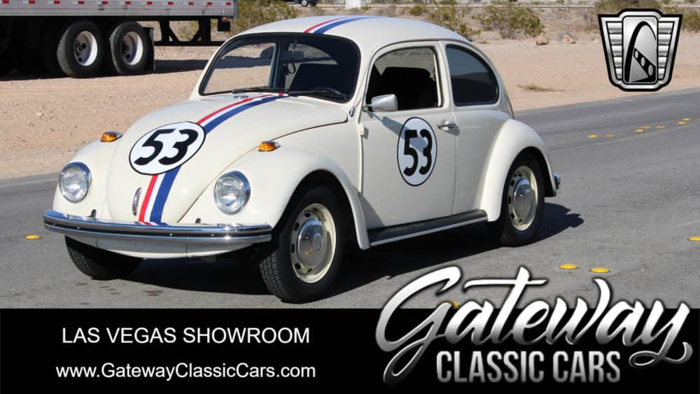 Gateway Classic Cars of Las Vegas presents this 1968 Volkswagen Beetle, a timeless icon of automotive design. This particular model comes in a striking white exterior color with Herbie graphics that complements its black cloth interior, creating a visually appealing contrast that is sure to turn heads.