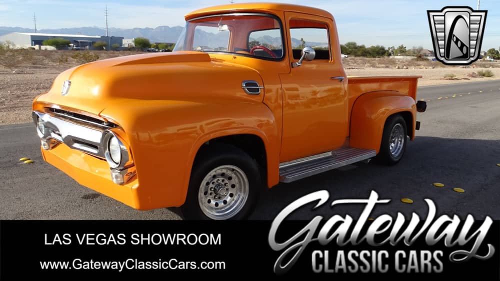 Gateway Classic Cars of Las Vegas would like to present this 1956 Ford F-100. For the 1956 model year, an all-new version of the F-Series made its debut. Increased dimensions, improved engines, and an updated chassis were features of the second generation, and the naming scheme change for the F-Series remains in place to the present day. The half-ton F1 became the F100 (partially influenced by the North American F100 Super Sabre jet fighter). This F-100 is powered by a 302 V8 running through a 4-speed Manual transmission. It is painted Orange and complimented with a Orange/White interior with an electronic gauge package. Work or play this classic will get it done and with a vintage style.