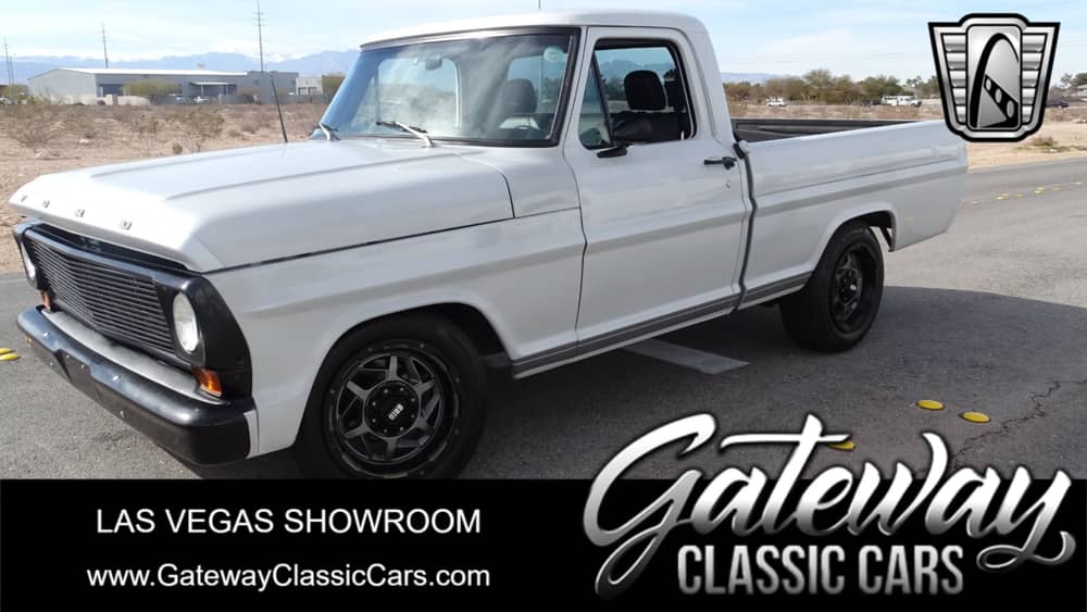 Gateway Classic Cars of Las Vegas would like to present this 1969 Ford F-100. Powered by a 390ci V8 running through a 4-speed manual transmission. This Classic pickup is painted white and complimented with a black interior and riding on black custom wheels. This truck has the following options: power steering, AM/FM with Bluetooth stereo. The following upgrades include: upgraded brakes and master cylinder and air bags for rear. This vintage Ford truck has the look and you will regret letting this one go.