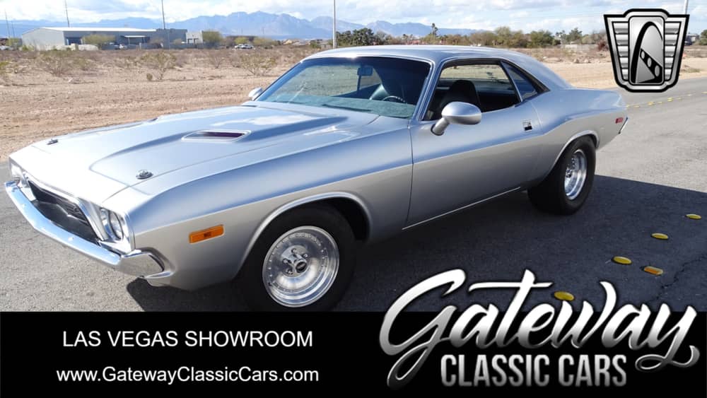 Gateway Classic Cars of Las Vegas presents this 1973 Dodge Challenger. This cool Challenger is finished in Silver with Black/Gray interior. It has a big 440 cubic inch Mopar V8 with a 4-speed manual transmission. This great looking Challenger has 'old school' American Racing wheels that give it that 70's muscle car look. It also has an updated custom dashboard.