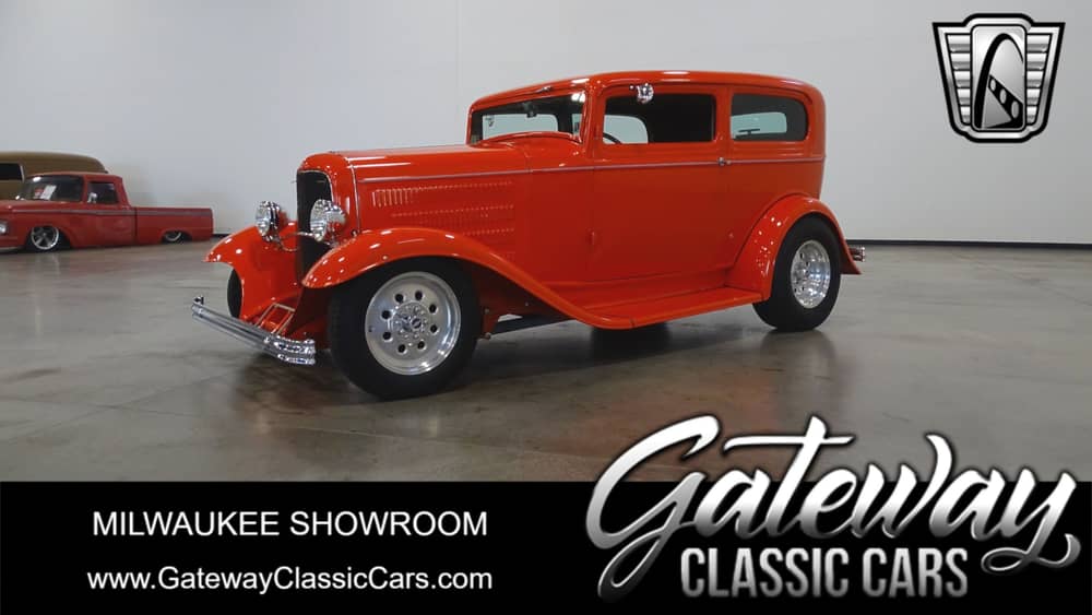 Gateway Classic Cars Milwaukee is excited to present this 1932 Ford two-door Roadster. This beauty is painted in in hugger orange with a meaty set of aluminum wheels and chrome wheels. The body has been chopped 3". Other body features include a filled cowl vent, "Wescott" fiberglass fenders, "V-8 Store" steel smoothie running boards, Deuce Factory S.S. head light bar, Dietz headlights, and a sunken power antenna. The tan cloth interior comes with split seats in the front with a bench in the rear. Modern gauges, a padded steering wheel w/tilt, seat belts, air conditioning, and an Am/FM/cd radio make this Ford a drivers dream.