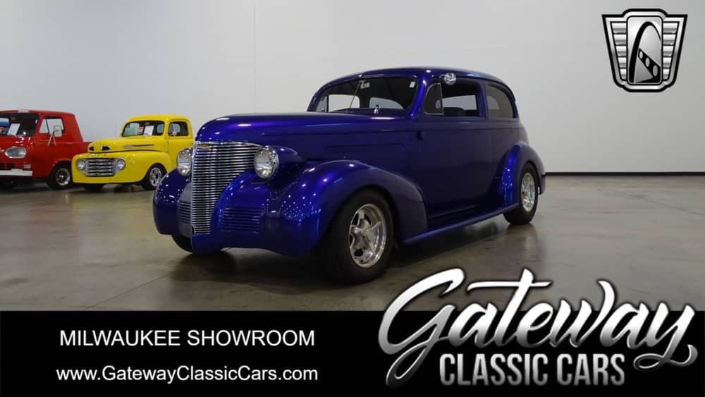 Gateway Classic Cars Milwaukee is excited to present this 1939 Chevrolet Two-door Four-passenger Coupe restomod. This purple beauty is accented with a meaty set of alloy wheels and tires, touches of chrome including the front grille, dual mirrors and trunk hinges. The body is steel with fiberglass running boards. The updated gray tweed interior brings the outside in with purple stripes running through the bucket seats and door panels. Updated features include air conditioning, leather steering wheel w/tilt, modern gauge package, power trunk, power antenna, seatbelts, power driver's seat, door poppers, and an Am/Fm/cd radio. Under the hood of this beauty is a 350 V-8 attached to a Turbo 350 three-speed automatic transmission.
