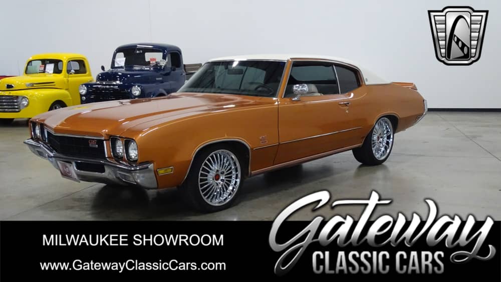 Gateway Classic Cars Milwaukee is excited to present this 1972 Buick Skylark Gran Sport Clone. This classic beauty is sure to turn heads with its bold orange exterior, a color that captures the spirit of the era. The light tan vinyl top and vinyl interior provides a striking contrast, creating a timeless aesthetic that is sure to impress. The aftermarket polished chrome wheels (18" fronts, 20" inch rears), custom pinstripes, and rear spoiler brings this Skylarks exterior appearance to a whole new level. The Buick Skylark Gran Sport Clone comes equipped with a variety of features for your comfort and convenience. The air conditioning system has been converted to 134 and ensures a pleasant environment inside the car, no matter the weather outside. The aftermarket JVC AM/FM radio with Bluetooth is neatly tucked in the glovebox leaving the original AM radio intact. An anti-theft system offers an added layer of security. Under the hood, you'll find a powerful 350 V8 engine paired with an automatic transmission, offering a smooth and responsive driving experience. Driving this classic car is a breeze, thanks to power brakes and power steering. The Magna Flow exhaust creates a throaty rumble that is music to your ears.