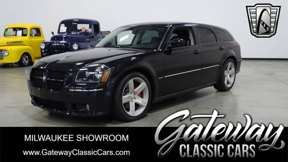 Gateway Classic Cars Milwaukee is excited to present this black 2006 Dodge Magnum SRT-8, with a blend of power and style. Under the hood of this Magnum SRT-8 houses a robust 6.1 Liter V8 engine paired with a five-speed automatic transmission, offering a smooth and powerful driving experience. The Magnum SRT-8 is fitted with 20" wheels, a firmer suspension, lower body fascia, bigger Brembo brakes w/ vented rotors, and a 425hp Hemi engine! A black and gray leather/ suede interior comes with front bucket seats, center console, and a range of features designed for comfort, convenience, and safety. This SRT-8 comes with an array of features including air conditioning, power windows, power locks, power mirrors, keyless entry, power/heated seats, tilt/telescopic steering wheel, rear defogger, rear wiper, cruise, anti-theft system, AM/FM/ 6 disk cd radio w/ navigation and so much more.