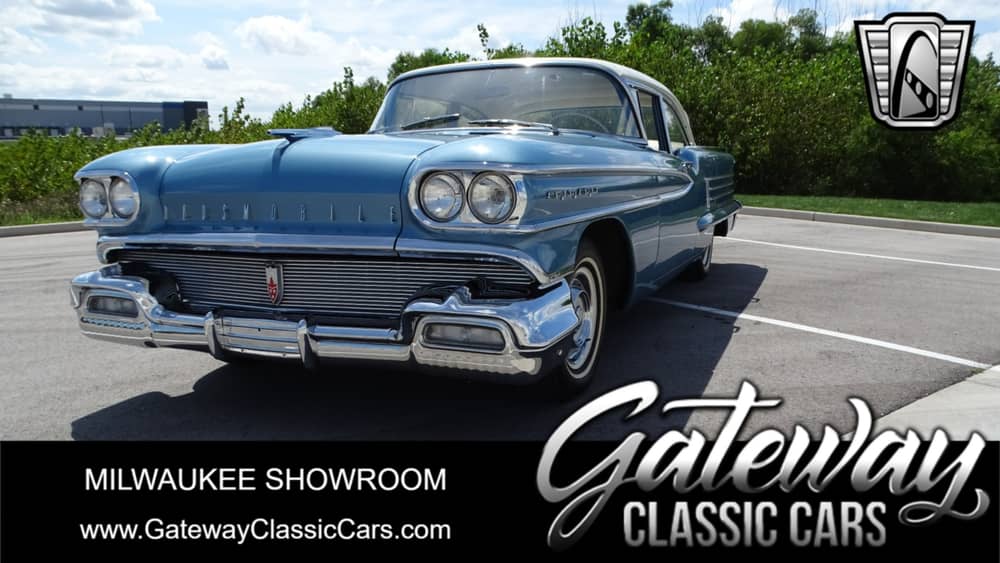 Gateway Classic Cars Milwaukee invites you to step back in time with the classic elegance of this 1958 Oldsmobile 88 four-door, a true icon of mid-century American automotive design. Draped in a striking blue exterior, this vehicle exudes both charm and sophistication, making it a standout choice for any classic car enthusiast. The timeless appeal of this Oldsmobile is further enhanced by its white wall tires and authentic hub caps, which complements the vintage aesthetic.