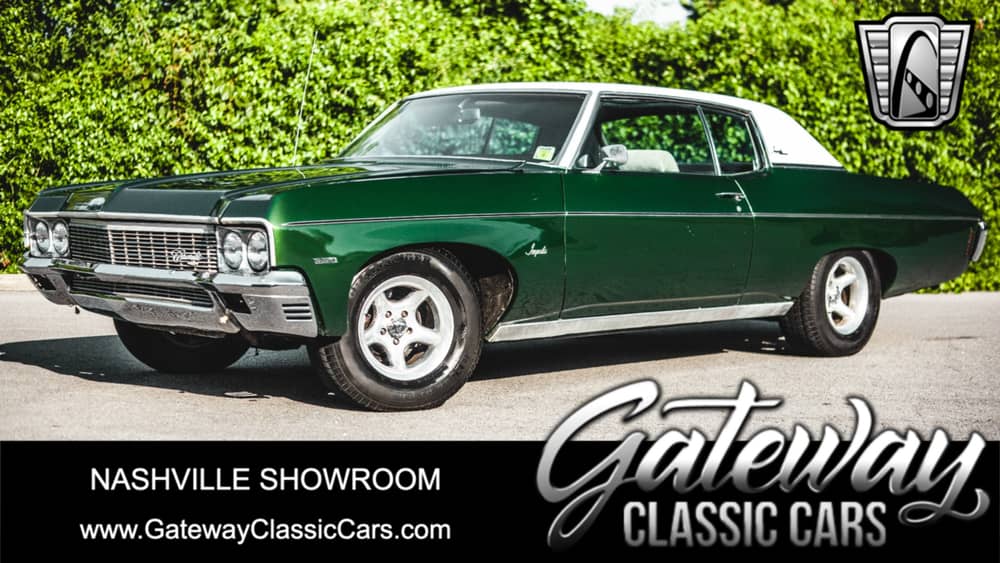 Gateway Classic Cars of Nashville Tennessee is proud to digitally present this land yacht 1970 Chevrolet Impala. With long body lines that stretch from bumper to bumper, and they just speak for themselves. With a dark candy green paintjob this Impala looks like a sinister villains car that is about to take the crew to the next heist. Powering this 1970 Impala is a powerful General Motors 350CID V8, one of the most manufactured engines in history of automotive and having a reputation of durability and dependability. Backing this powerplant is a stout General Motors TH350 3-spd automatic transmission that is smooth to shift but when you stomp down on the gas pedal you can expect to have your head tossed back into the headrests! The interior of this sweet machine soft and tan in color and a plush sport seating experience. Now is a chance to own a car that if one of these new plastic cars decided to get in your way and run into you, ya just might need a bumper where they will need an entire car! Trunk space is what we call " 8-body" as it can hold a lot of cargo! Options on this 1970 Impala include : Power steering, Power brakes, AC-needs compressor to be functional, Manual windows and locks, AM/FM/CD player as well. For more information please feel free to reach out to the Nashville staff at 615-213-1800 or visit us at