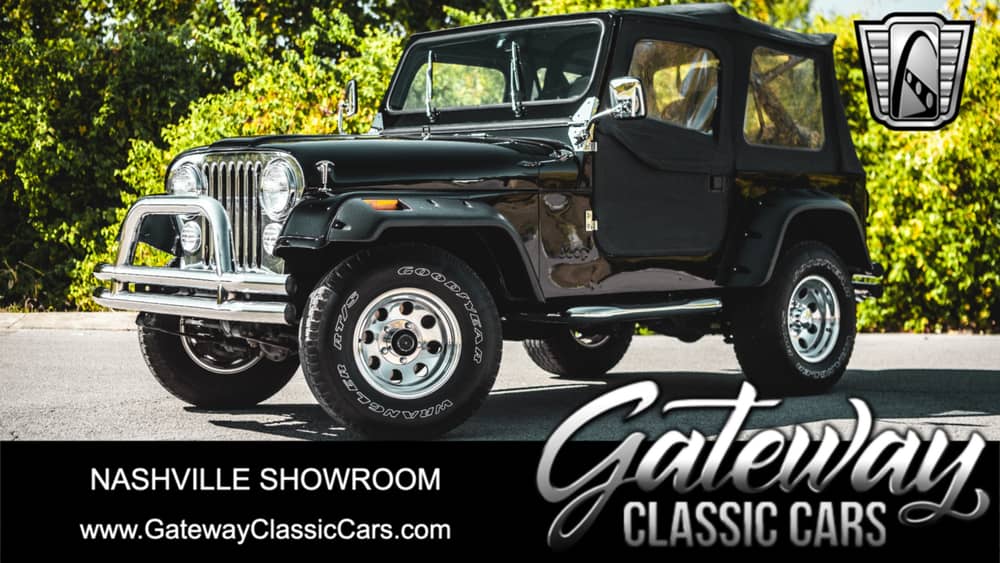 Gateway Classic Cars of Nashville Tennessee is proud to digitally showcase this sinister 1985 Jeep CJ7 4x4. What an incredible build, the amount of care and love that went into the restoration on this jeep is wild. With a high gloss jet black paint job that screams at you, to put it different the shine is so high on this that you could use it as a mirror to shave! Powering this beautiful machine is a fresh 4.2L inline 6cylinder and for anyone that knows this engine you can rest assured that you have many decades of life in this jeep. This also pairs to the rebuilt 4-speed manual transmission, this is great if you have to take you jeep off the road and climb some rocks like a billy goat. Take the top off and live your life, heck leave it on and take the doors off? The interior is just as nice, with a fresh interior that looks like it just came of the factory your jeep was built at.This jeep is about to make a dream come true to the next owner and now is your time! Options on this 1985 Jeep CJ7 include: Am/Fm Cd player, Power steering, Horse power, Posi Traction, Vinyl interior, performance radials wrapped around a hot set of wheels. For more information feel free to call the Nashville showroom at 615-213-1800 or visit us on the web at www.gatewayclassiccars.com