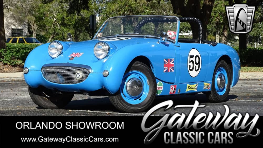 Gateway Classic Cars of Orlando is proud to present this fun little 1959 Austin Healey Sprite. Often called a "Bugeye" or "Frogeye" Sprite, these little roadsters were produced from 1958-1961 and have garnered an almost cult like following. While most cars of the day were a body on frame construction the Sprite featured unibody construction. This bright blue example has a track oriented setup with a roll bar and an assortment of decals from typical race sponsors of the day. These cars make great racecars because of their light weight and handling characteristics. The horsepower may not be a huge figure, but with a proper 4 speed manual and the wind in your hair, it certainly is an exhilarating ride. Under the front tilt clamshell hood is a 948 cc inline 4 factory rated at 43 horsepower and 52 lb ft of torque. With it’s close slick shifting 4 speed manual imagine how this little bugeye can get up and go! According to the owner recent work to this car includes new wiring harness, electronic distributor, carb & intake, brakes and more. If you’re looking for a fun classic roadster to zip around town in this is the one you want to own! Options include spare tire, hub caps, jack, vinyl interior, seat belts and front disc brakes.