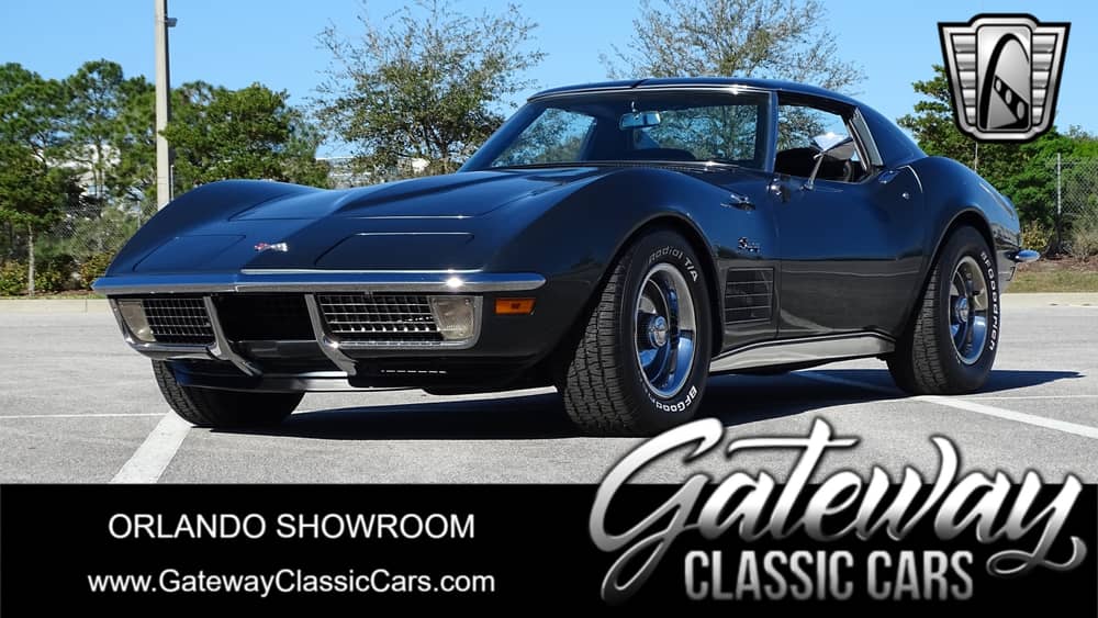 Gateway Classic Cars of Orlando is proud to offer this awesome 1970 Chevrolet Corvette. 1968 was the first year of the C3 Corvette, heavily inspired by the Mako Shark II concept car. At the time this breath taking new design made for tough competition against the European exotics of the day. Of the C3 generation Corvettes the 68-72 models are highly sought after thanks to their chrome bumpers and svelte body lines. This 70 example looks pretty sharp in it’s rare Laguna Grey paint. As you walk around the vehicle you’ll notice nice details like the rally wheels, white letter tires and front fender gills. The interior is all sports car with black bucket seats and center console. No matter how you shake it, you got a really sharp Corvette! Powering this C3 Corvette is a 350 cubic inch V8 and is paired to a TH400 3 speed automatic. Imagine how this car can get up and go! According to the owner recent work includes new vacuum lines, new upholstery, new cabin insulation and more. A Corvette this attractive, you are sure to impress at your local car cruise. If you’re looking for a classic Vette this is the one you want to own. Options include air conditioning, AM/FM radio, spare tire, t-tops, power brakes, power steering, jack, seat belts, leather interior and rally wheels wrapped in radial white letter tires.