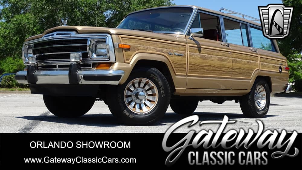 Gateway Classic Cars of Orlando is proud to offer this beautiful 1986 Jeep Grand Wagoneer. Adored by all the Jeep Grand Wagoneer has a storied history. Dating back to the early 60s the Wagoneer pioneered the SUV segment. Continuing as a sales leader for decades, the Grand Wagoneer has become an American icon of luxury and go anywhere toughness. This 1986 example looks handsome with it’s wood paneling set against the gold shade of paint. As you walk around the vehicle you’ll notice nice details like the alloy wheels, roof rack and chrome trim. Take a seat inside an you’re greeted by true American luxury with seats upholstered in a real sharp red leather with cloth inserts. Under the hood is a 360 cubic inch V8 and is paired with a 3 speed automatic. Also featuring low range 4 wheel drive imagine how this Wagoneer can get up and go! According the owner the engine has been recently rebuilt as well as received a new radiator, AC compressor, distributor and more. If you’re looking for a sharp example of America’s favorite SUV this is the one you want to own! Options include AC, AM/FM/CD radio, spare tire, power steering, power brakes, power windows, tilt wheel, seat belts, leather interior and radial tires.