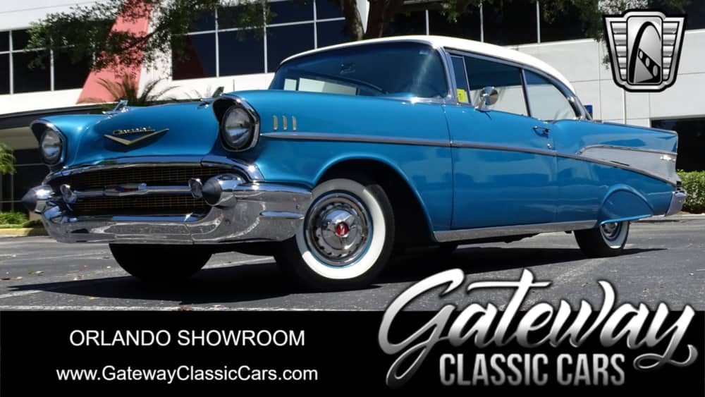 Gateway Classic Cars of Orlando is proud to present this breathtaking 1957 Chevrolet Bel Air. In the world of classic cars nothing defines the genre quite like a 57 Bel Air. From the distinct front end to the big tail fins these cars scream iconic! This example is finished in a handsome Harbor Blue with white roof. As you walk around the vehicle you’ll notice nice details like the double hood ornaments, intact side trim pieces and dual chrome exhaust tips. Take a seat inside and you are transported back in time. The two tone black and blue seats are upholstered in a combo of vinyl and cloth. The dashboard and gauges are stylish out the wazoo and the view over the hood is majestic. Under the hood is a 283 cubic inch V8 and is paired to a 2 speed powerglide automatic. Imagine how this Bel Air can get up and go! If you’re looking for a sharp example of an iconic classic car this is the one you want to own! True miles on this vehicle are unknown as odometer is non-functional. Options include AC, AM radio, vinyl interior and white wall tires.