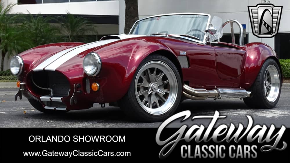 Gateway Classic Cars of Orlando is proud to present this 1965 Cobra Replica by Backdraft Racing. When it comes to Cobra replicas there’s nothing like a Cobra Replica from Backdraft Racing. This one-owner replica has the classic Cobra look that everybody loves such as single roll hoop, knock off style wheels and big shiny side pipes. Finished in an eye catching Monterey Red with white stripes this Cobra looks super serious! As you walk around the vehicle you’ll notice nice details like the hood scoop and 427 badging. The interior is quite luxurious with Dove shaded quilted leather lining the bucket seats and door panels with Diamond Stitching. The steering wheel takes you back to the 60s and the gauges are all business for the serious driver. Under the hood is a Dart block 427 Cubic Inch V8 that sounds like a screaming banshee when you rev it up. Some nice features on this engine include Edelbrock Aluminum cylinder heads, Hydraulic Roller Cam, a Holley 770 carb and much more. Power is sent through a Tremec 5 speed manual transmission so imagine how this little snake will get up and go! If you’re looking for a Cobra to rip around a road course or just cruise to your favorite car show, this is the one you want to own! Options include power brakes, seat belts, limited slip rear, leather interior and alloy wheels wrapped in radial tires.