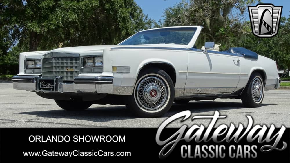 Gateway Classic Cars of Orlando is proud to present this stunning 1985 Cadillac Eldorado Biarritz Convertible. Through the 50s and 60s the Cadillac brand sailed as a leading luxury automaker with their ever evolving lineup of full size sedans and coupes. Back in those days nothing announced your arrival quite like one of these land yachts. Through the 1980s their lineup was downsized however these vehicles still retained the presence and cloud like ride that defined the brand. This 85 Convertible is looking bright and handsome in it's white paint. The power folding convertible top is white and has a navy blue boot cover. As you walk around the vehicle you'll notice nice details like the gold hood ornament, bold grill and wire wheel covers. Take a seat inside and you'll find a handsome interior upholstered in white pillowtop leather. Pile in the whole family and imagine the places you can go! Under the hood is a 4.1 Liter V8 and is paired with a 4 speed automatic transmission. Imagine how this car can get up and go! If you're looking for a classic Caddy this is the one you want to own! Options include AC, AM/FM radio, leather interior, power brakes, power steering, seat belts and white wall radial tires.