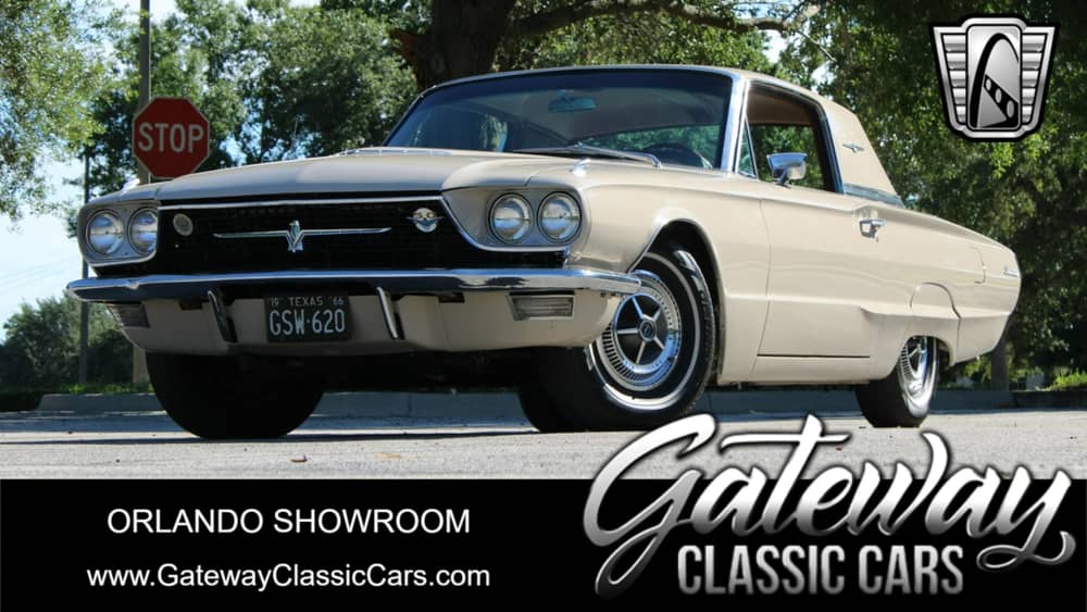 Introducing a classic icon of American automotive design: the 1966 Ford Thunderbird. This stunning vehicle boasts a sophisticated Desert Sand exterior color that complements its elegant lines and timeless appeal. Step inside to find a luxurious Saddle interior, crafted with high-quality vinyl that exudes both comfort and style.