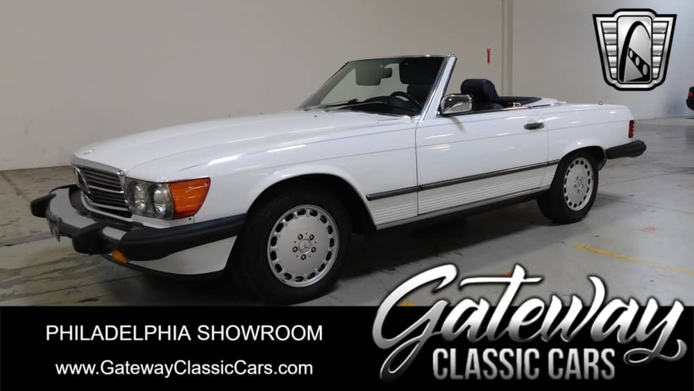 Gateway Classic Cars is happy to present this 1988 Mercedes Benz 560SL for sale. This 560SL is powered by a V8 and backed by an Automatic transmission. Painted in White with Navy Blue Leather interior it is sure to be noticed. Options on this 1988 Mercedes Benz 560 SL include: AM/FM Radio, Manual Convertible Soft Top, Spare Tire, Jack, Power Locks, Power Steering, Power Brakes, Power Windows, Anti-Lock Brakes, Telescopic Wheel, Driver Airbag, Leather Interior, Wire Wheels, and Radial Tires