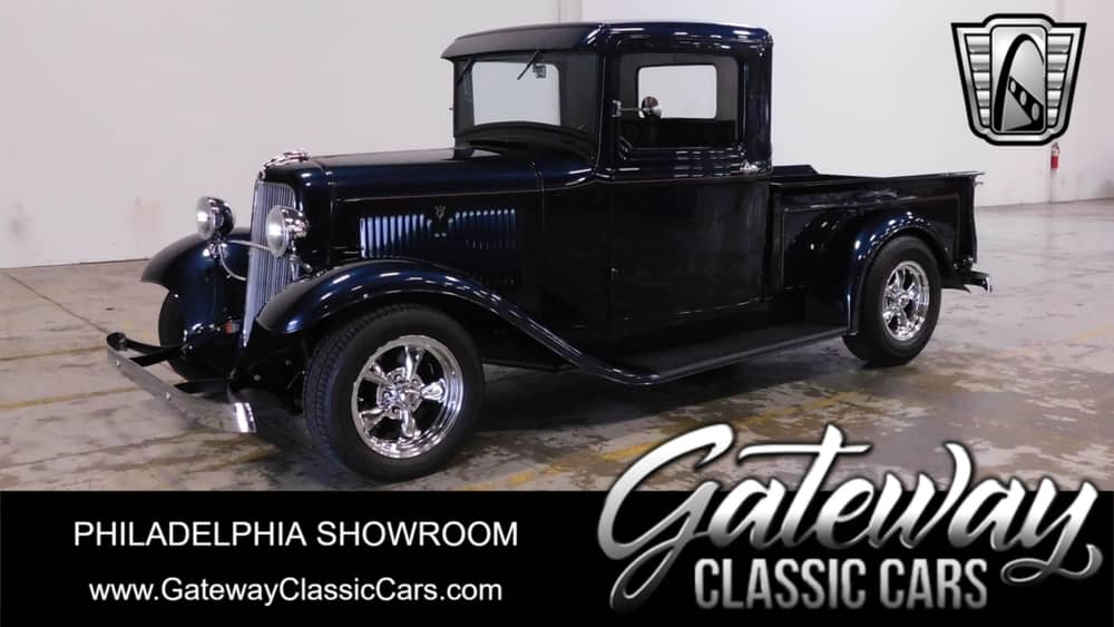 Gateway Classic Cars is happy to show off this Twilight Blue 1934 Ford Pickup truck for sale. Powered by a 302 CID V8 bored .030 over with a Billet Aluminum pulley system. All that is pushing sound thru a Dual, Aluminum exhaust with Pro Flow Mufflers. This Pickup has a Ford AOD Automatic Transmission with a Ford 8' Rear with 3.00 gears and Mustang II front end. Painted in DuPont Twilight Blue Metallic base coat/clear coat and custom pinstripe accents. The Interior carries the Blue and custom accents inside on the dash and seats are done in Black Vinyl. Inside you have a Tilt Wheel and Seatbelts. The Bed of this Ford is done in Oak and contrasts great with the paint. The mileage on the odometer is since rebuild and shows at 2621k. Additional options on this Ford include Power Steering and Brakes, Radial Tires and Aluminum/Alloy Wheels.