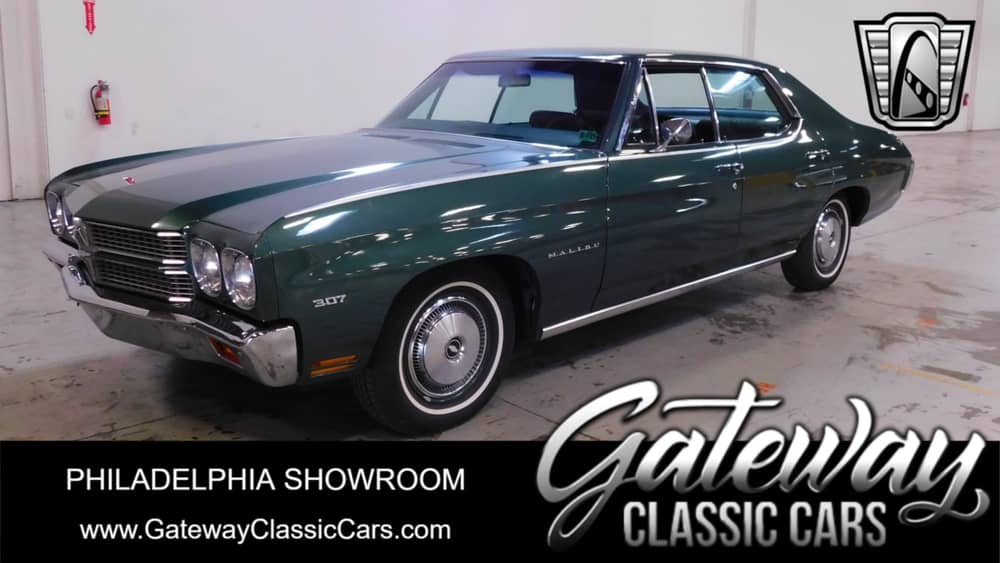Gateway Classic Cars is happy to show off this 1970 Chevrolet Malibu Sport Sedan for sale. This Malibu is Powered by a 307 V8 mated to an Automatic Transmission and believed to be on the Third owner. The Current owner advised that the original owner passed the car on to his Nephew who sold to him about three years ago. Painted in Green with matching Green Cloth Interior and sitting on a set of White Walls. Options include an Aftermarket AC, AM Radio, Power brakes and Steering, Radial Tires and hub Caps.