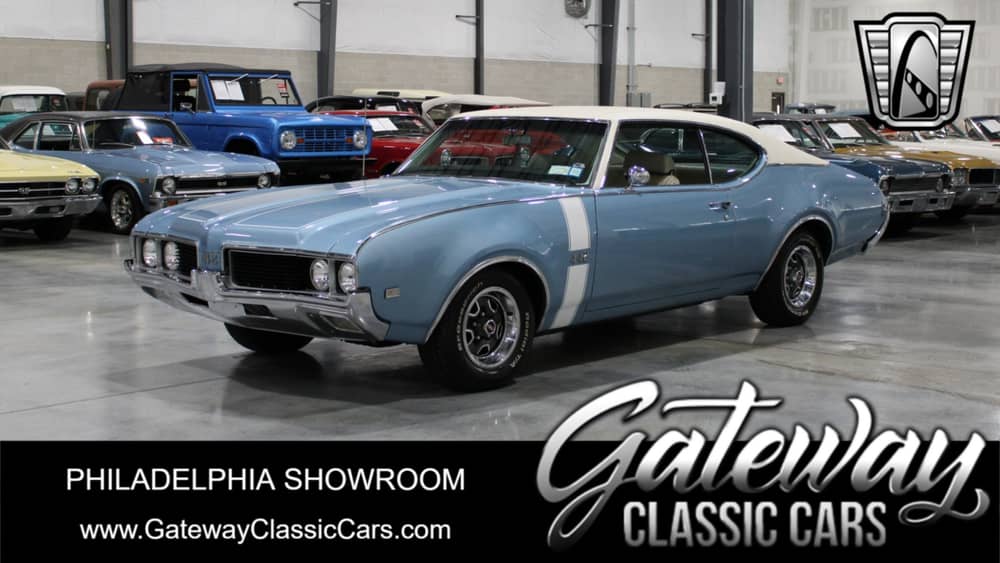 Gateway Classic Cars of Philadelphia proudly presents the 1969 Oldsmobile 442, a true icon of the muscle car era that combines performance and style in equal measure. This particular model boasts a stunning blue exterior that captures attention and admiration wherever it goes, accentuating the sleek lines and aggressive stance that the 442 is renowned for. The interior is a harmonious contrast, featuring a crisp white vinyl that exudes a sense of luxury and comfort, creating an inviting atmosphere for both driver and passengers alike.