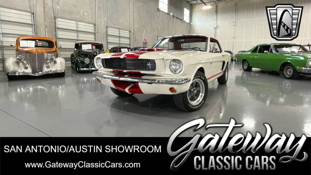 Gateway Classic Cars of San Antonio/Austin is proud to offer this true American classic 1966 Ford Mustang. This second-year model of one of the most successful cars throughout history is a great display of why the Mustang has had such lasting success. The Mustang has been so popular for Ford that it is still in production for more than 5 decades. In 1966 alone, 607,568 Ford Mustangs were sold, holding the record for the greatest-selling Mustang of all time. This 66 is a standout with its replica Shelby trim package. The gorgeous Wimbledon white paint is accented with a bright red racing stripes that run the length of the car. All set off by the coolest red and white two-tone vinyl interior you have laid your eyes on. Under the hood of this beauty is a 302 cu in V-8 attached to a smooth shifting Tremec 5speed manual transmission. With all the power transferred to an eight-inch rear end with a 3:50 gear ratio. Power steering makes this Mustang a breeze to drive. The awesome exterior is complimented by meaty mag wheels mounted on raised white letter tires and dual chrome mirrors. Interior features include a Retrosounds AM/FM cassette radio, seat belts, custom carpet matching floor mats and a replica Carroll Shelby signature on the glove box door. This 1966 Ford Mustang is a real head turner. Don't miss out on this one!