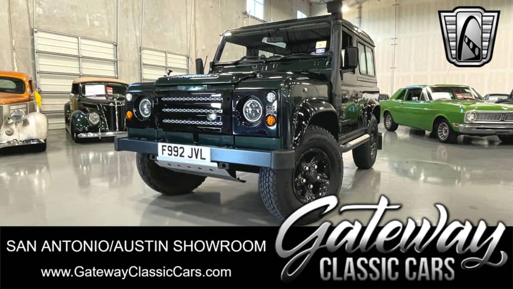 Gateway Classic Cars of San Antonio/Austin is excited to offer a British off roading masterpiece, this 1988 Land Rover Defender 90! Introducing the 1988 Land Rover Defender 90, a classic SUV with a striking green exterior with black diamond plate and a sleek black interior. This vehicle is powered by a robust 2.5 L Turbo Diesel I4 Cylinder engine, paired with a 5-speed manual transmission, offering a smooth and powerful driving experience. A complete service was professionally performed Dec. 2022 that included new brake lines, transmission seals, master & slave clutch cylinders, wiring harness, an electric fan and new fuel injector pumps & lines, so this Defender is ready to enjoy!