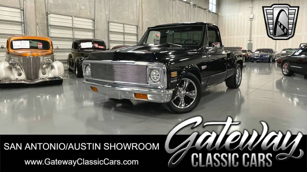 Gateway Classic Cars of San Antonio/Austin is proud to offer this iconic 1972 Chevrolet C10 Step side. Sleek black paint, an upgraded V8, and a leather-lined A/C interior all come together on this 1972 Chevrolet C10 to give you the vintage step side pickup you've always wanted. The engine bay is filled with big block power. This 454 cubic-inch V8 is a sought-after addition for fun power. Plus, this one inhales deeply through a chrome air cleaner, and it exhales with added power and authority through the dual exhaust. The clean and tidy undercarriage shows the kind of components that give you confidence on the road. And this one also has the right cruiser features, like power steering, a smooth shifting TH400 three-speed automatic transmission, front disc brakes, and a set of chrome 18" Boss torque thrust wrapped in grippy sports tires. The interior keeps the pickup's classic style, but it also makes sure to upgrade this for more comfort and freshness. The newer bucket seats are dressed in black, this goes well with the smooth dash pad, clean door panels, and soft carpeting with protective mats, all done in black. Because this one was built to be a driver there are the right upgrades like a custom center console with a touch screen Kenwood radio with Bluetooth, cold blowing Vintage air conditioning, tilt steering with a custom leather wrapped steering wheel and power brakes. This 1972 Chevrolet C10 is a sleekly done truck with upgraded big block power and the right stance to show its muscles. So, when you want a short bed Chevy with the right attitude, this is the one.
