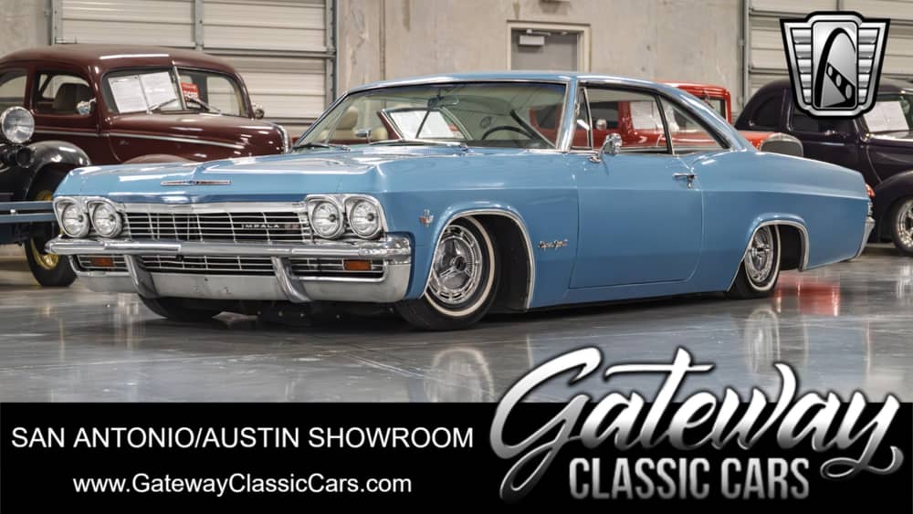 Gateway Classic Cars of San Antonio/Austin is excited to present this 1965 Chevrolet Impala SS, equipped in a stunning blue exterior that complements its beautiful white interior. This timeless beauty is powered by a 350 CID V8 engine, paired with a smooth automatic transmission, offering a driving experience that is both powerful and effortless. The Impala SS is equipped with an AccuAir air bag suspension system, providing a modern touch to its classic design, ensuring a ride that is as comfortable as it is stylish. Inside, the Impala SS is designed for comfort and convenience. It features air conditioning to keep you cool on warm days, and an AM/FM radio to enjoy your favorite tunes as you cruise down the road. For those who love to explore, the GPS navigation system ensures you always find your way with ease. The seats offer lumbar support, making long drives a pleasure. The driving experience is further enhanced by power brakes and power steering, allowing for easy maneuverability and control. The tilt steering wheel offers customizable comfort, ensuring that drivers of all sizes can find their optimal driving position. The classic white wall tires add a touch of vintage elegance to the vehicle's overall aesthetic, making this Impala SS a true standout on the road. This 1965 Chevrolet Impala SS is a remarkable blend of classic style and modern amenities, making it a great choice for those who appreciate the charm of vintage automobiles without sacrificing contemporary comforts. Whether you're a collector or simply someone who appreciates the finer things in life, this Impala SS is sure to impress.