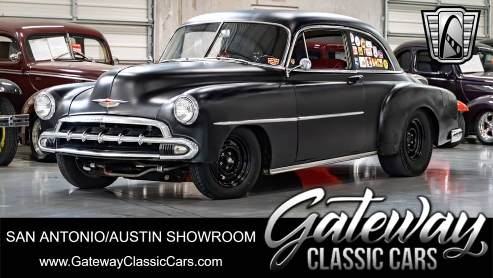 Gateway Classic Cars of San Antonio/Austin is proud to present this 1952 Chevrolet Styleline Deluxe. Dressed in a black exterior, this vintage car commands attention and admiration wherever it goes. The timeless allure of its design is complemented by a wine and eggshell interior, creating an inviting atmosphere that transports you to an era of elegance and charm. Under the hood, this Styleline Deluxe is anything but ordinary. It boasts a formidable 406 CID V8 engine, paired with a B&M Turbo 350 automatic transmission. While performance is not the focus here, the full exhaust system ensures that this classic car produces a deep, resonant sound that is music to any car enthusiast's ears. The exterior is further enhanced by the presence of 29-inch cheater slicks on the rear, giving the car a bold and aggressive stance. Rally wheels add a touch of sporty flair, while coil over shocks provide a smooth and comfortable ride, ensuring that every journey is as enjoyable as the destination. Inside, the tilt steering wheel offers a touch of modern convenience, allowing for a customizable driving experience that caters to your comfort. The vinyl interior of this Chevrolet Styleline Deluxe is both durable and stylish. The combination of wine and eggshell tones creates a warm and inviting space that is great for both leisurely drives and spirited outings. This classic car is a testament to the enduring appeal of vintage design, seamlessly blending the past with thoughtful updates that enhance the driving experience. Whether you're a collector or a classic car enthusiast, this 1952 Chevrolet Styleline Deluxe is a great find that promises to delight and inspire.