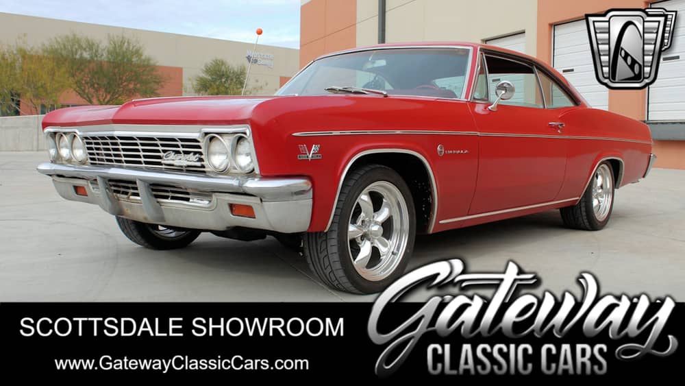 Gateway Classic Cars of Scottsdale is proud to present this muscular 1966 Chevrolet Impala. Under the hood of this 2-door fastback body is a 396 cubic inch V8 that is believed to be original to the car. An automatic transmission handles all the shifting so you can focus on enjoying the experience that only a classic muscle car like this can provide. The Bright Red paint has been laid down smooth as glass and shares color with the vinyl interior as well. A Flowmaster dual exhaust system was fitted to give that authentic old school muscle sound. The Impala has also had some preventative maintenance recently including having the carburetor, alternator, and radiator rebuilt. A set of American Racing chrome wheels were also fitted to really add some style to this beauty. This Impala will keep you smiling all year round!