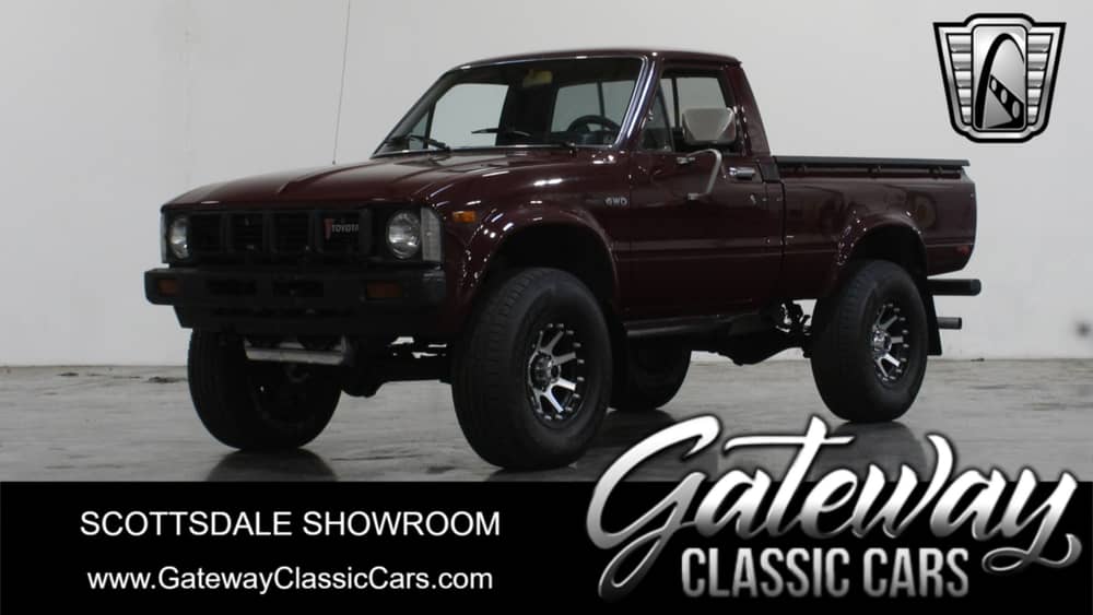 Gateway Classic Cars of Scottsdale has jumped at the chance to offer for sale, on consignment, this "you don't see that every day" 1981 Toyota truck! Sure a freshly restored, 1981 Toyota truck is a rarity these days, but the power plant on this one really, really sets it apart from the rest. Feast your eyes on a 1981 Toyota truck with a carbureted Ford 302 cubic inch V8 stuffed under the hood and mated to a 5 speed manual transmission both with just around 200 miles on them. Hearing a V8 rev out of an old Toyota truck is about as weird as a Japanese sport bike sporting a Harley engine, but just because it can be done, does it mean it should? Our answer to this is a resounding "yes"! There are dual electric fans hanging below the bumper will catch your eye but not before the beautiful Peterbuilt Red paint draws you in to the clean lines of this truck. Inside the black Leather bucket seats have a custom touch and are very comfortable. As much of the OEM look and components on the interior were retained including the steering wheel and radio! Additional features include aluminum aftermarket wheels, AM/FM radio, power brakes and power steering. The truck is currently sitting as a 2wd configuration however everything but the front drive shaft is there to make it 4wd. This truck is far, far more done than not but it could use a few odds and ends to be 100%. Surely a solid platform and solid built to either improve upon or just enjoy. Call our sales staff to get the details on this beast and how to go about making an offer to purchase!