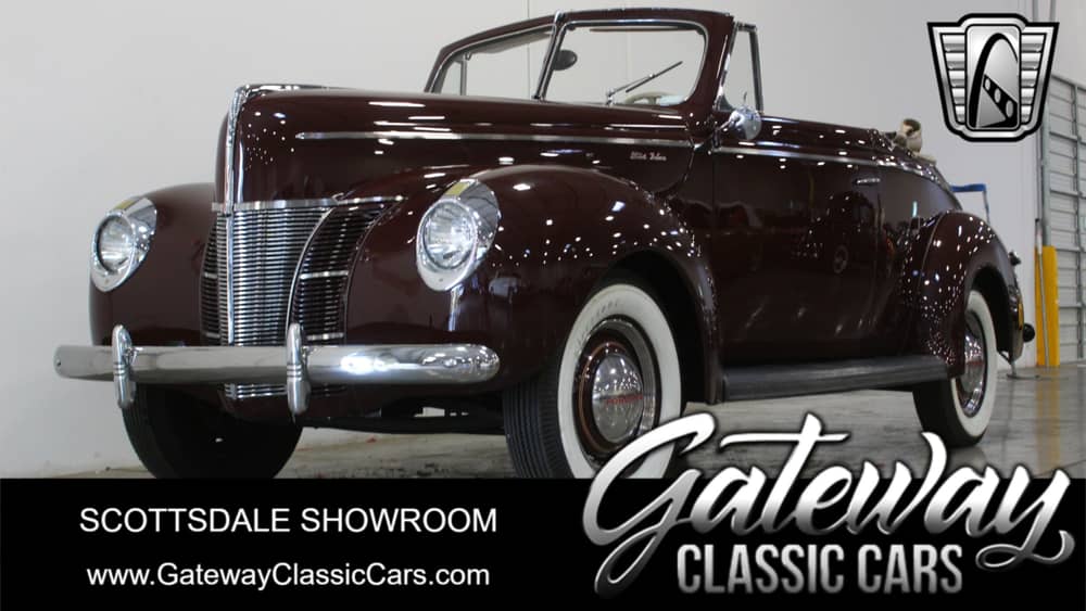 Gateway Classic Cars of Scottsdale is pleased to present for sale, on consignment, this gorgeous 1940 Ford Super Deluxe Convertible! The 221 cubic inch Flathead V8 is a nice and quiet little engine. The 3 on the tree manual transmission shifts nice and smooth. The Maroon Garnet paint is in great shape and the Tan vinyl interior is in just as good of shape as the paint. The light tan convertible top is also in good shape, the hydraulics that make it a power top were disengaged, making it a manual convertible top. A mild amount of work went into getting it in the good running shape that its in but history on the car was not passed on to the current owner who has possessed the car for the last 2 years. Features and Options include Manual Convertible Top, Vinyl Interior, Seatbelts, Wide White Wall Tires, Spare Tire, Convertible Top Boot and Seatbelts. If a leisurely cruise is in your blood, this is the car to be do it in and you will be doing it in style. Reach out to our sales staff by phone, text or email to get your questions answered and the process started so you can bring this one home to you!