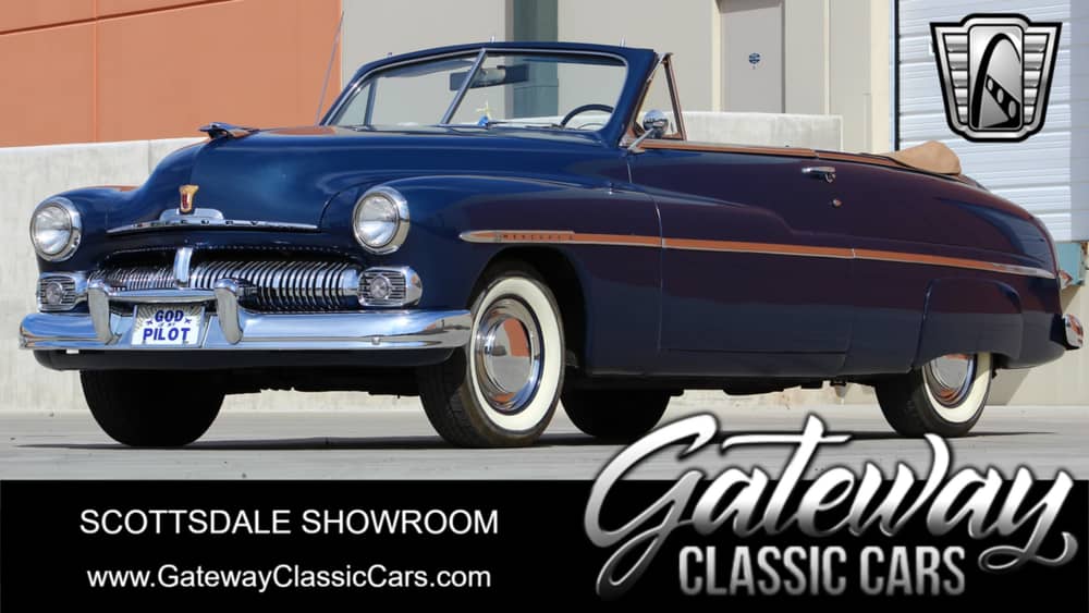 Gateway Classic Cars of Scottsdale is honored to present for sale, on consignment, this stunning 1950 Mercury Zephyr Convertible M76. This Banning Blue Zephyr is fitted with a Tan Bedford Cord convertible top with a matching convertible boot. Power comes by way of a 255 cubic inch V8 that is mated to a 3 speed on the column, manual transmission. The interior front and rear seats were rebuilt and covered in the correct two tone blue vinyl and cloth stripes, rare power windows are a welcomed luxury. Other features and Options include AM/FM Radio, Electric Fan, Power Steering, Seatbelts, White Wall Tires and a Finished Trunk with a Car Cover. The restoration of this beauty is striking and all of us here at the showroom have heard the resounding comments coming from walk in customers who see it for the first time. The engine runs great, is quiet and the comfort levels are most notable at cruising speed. This car is great at capturing people's attention and would be a great addition to any collection. Contact our sales staff for the details and thank you for looking!