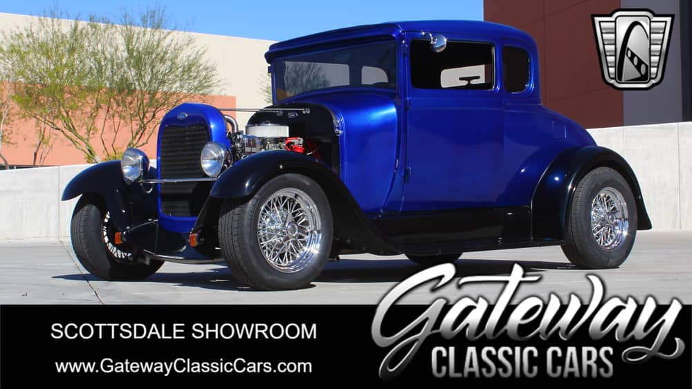 Gateway Classic Car of Scottsdale is pleased to present for sale, on consignment, this beautiful blue 1929 Ford Model A 5 Window Coupe. 16 years of ownership has come to an end for the current owner who is looking for a good home for his prized possession. Finished in an eye grabbing blue and black exterior, this 29 sports body mods like shaved door handles, shaved trunk, a retractable license plate custom paint and custom wheels. Power comes by way of a 5.7 liter 350 cubic inch V8 that is mated to a Turbo 350, 3 speed automatic both reported to have been rebuilt around 15,000 miles ago. Inside you will find a GT Grant steering wheel, White Faced VDO Gauges including Tachometer, Speedometer, Water Temp, Oil Temp, Volt Meter and Fuel Gauge, Door Popper buttons, Power actuated trunk button and Vintage Air Controls. Features and Options include A/C, Hidden AM/FM/CD Radio, Cloth Interior, Power Locks, Power Windows, Detailed Engine Bay, Radial Tires and Wire Wheels. There is a lot of pride in this car by the current owner and he really hopes the next person appreciates it as much as he and his wife have. Contact our sales department by phone, text or email to learn more about the purchase process and thank you for looking!